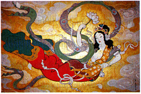 本堂天井に日本芸術院の豊川蛯子画伯画6帖大の「飛天」壁画、鐘楼には人間国宝、香取正彦門弟 鴇田力 鋳造の梵鐘を備える。
